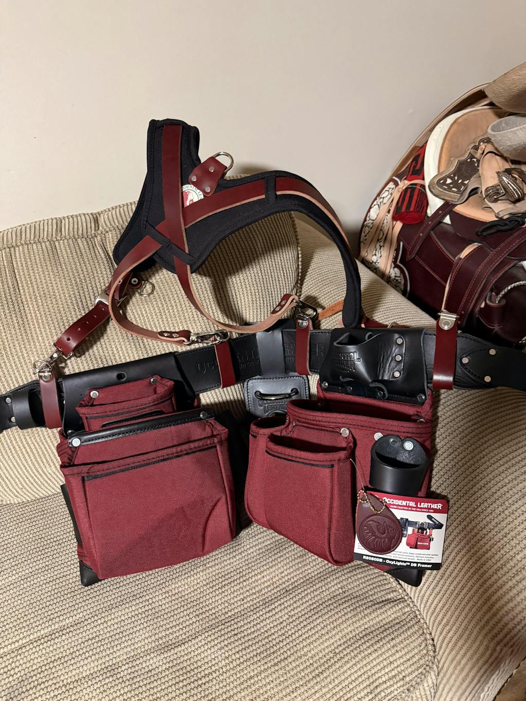 The OxyLights™ Framer Set combines industrial nylon and leather for a lightweight, durable tool belt system. Designed for framing and general carpentry, this set includes two three-pouch bags, a hammer holder, and a heavy-duty Ranger Work Belt. Padded nylon pouches hold their shape, and reinforced leather corners increase longevity.