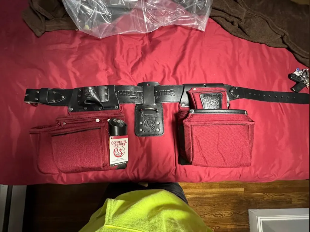 - Fastener Bag (opposite side): Holds nails, square, bits, etc.